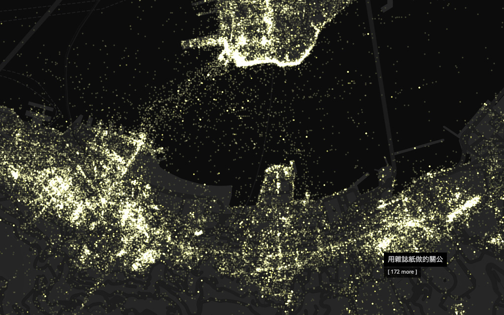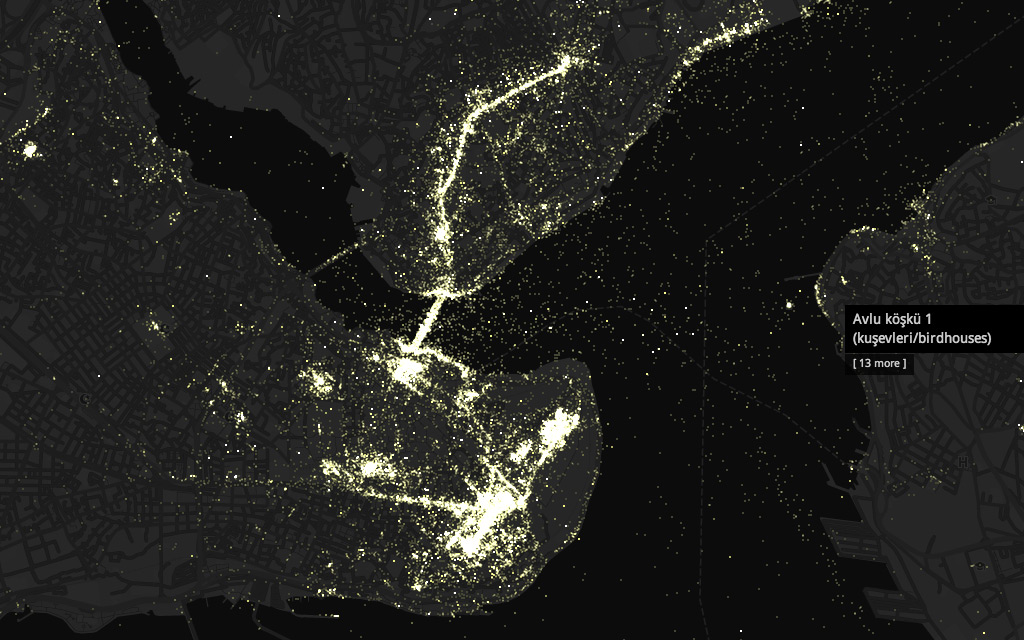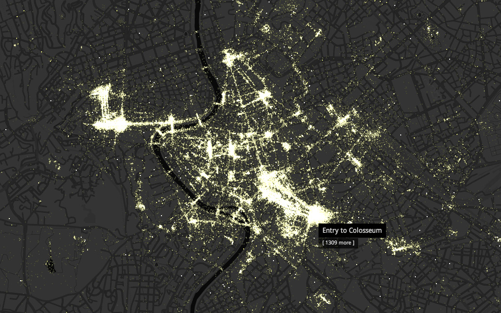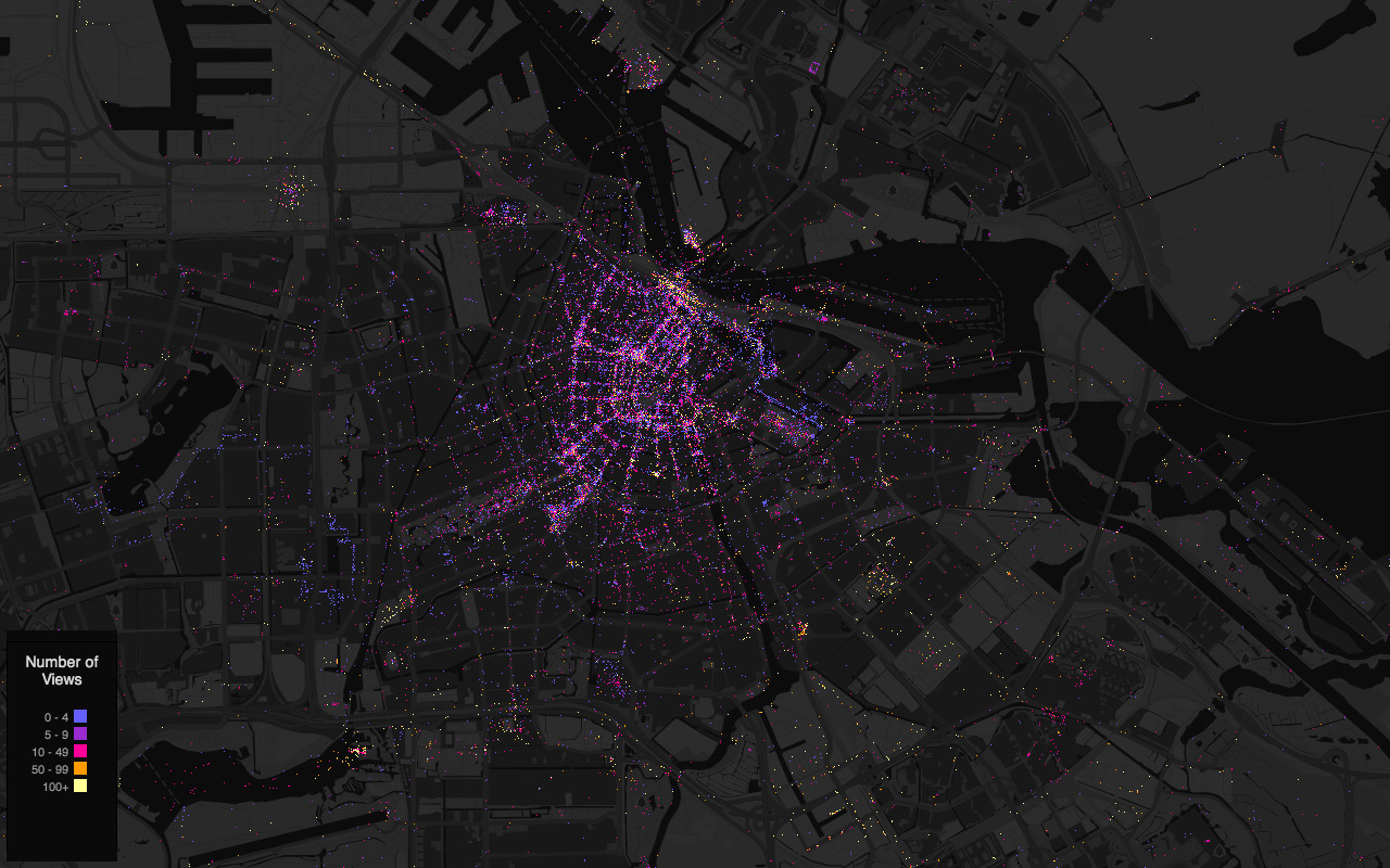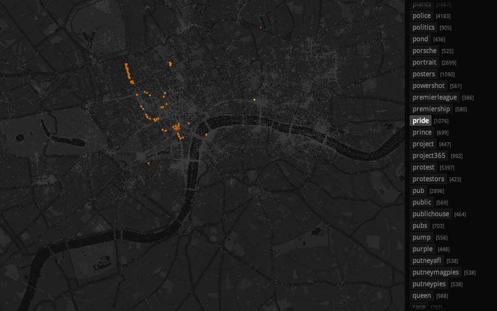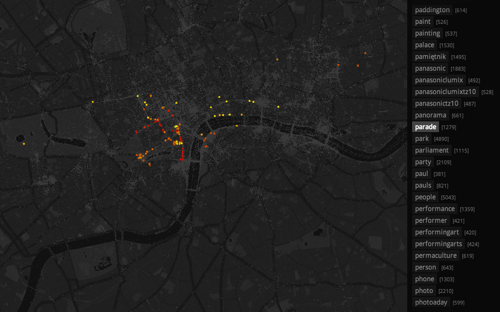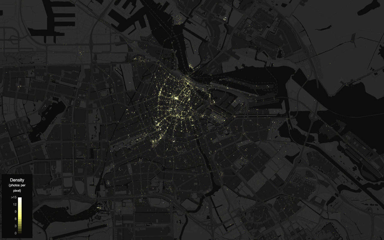The interactive maps reveal different facets in the photos spatial and temporal content. Animations of the photo data portray both the rhythms of human activity, and the large-scale changes and events that shape its history. Thematic mappings of the photos tags and metadata shed light on political and social concerns. The traces of protests, riots, and occupations appear alongside the background hum of tourism and sightseeing.