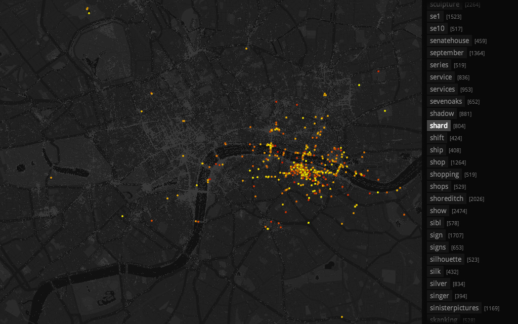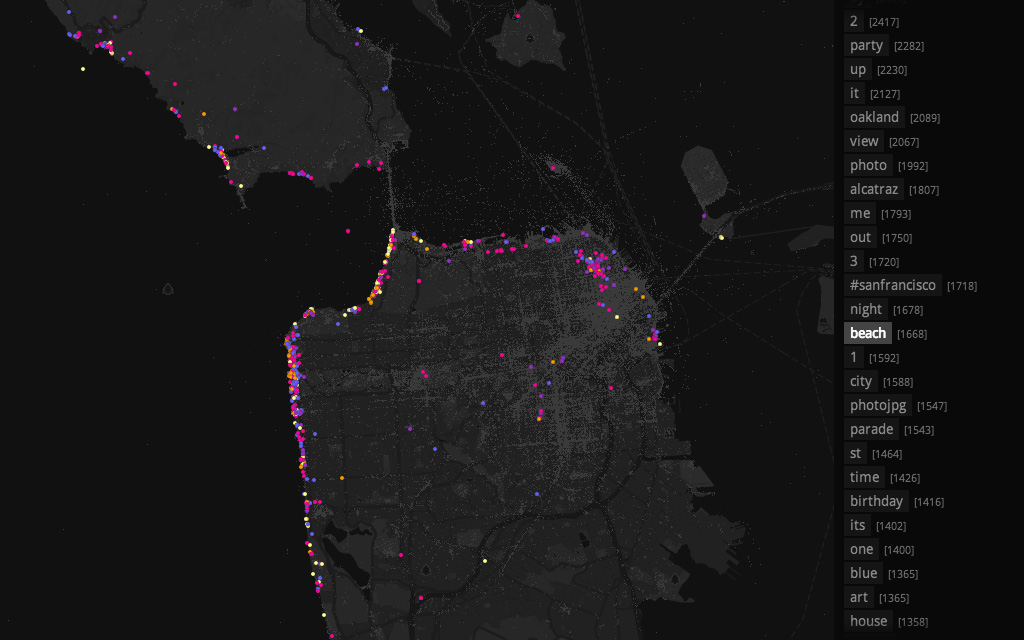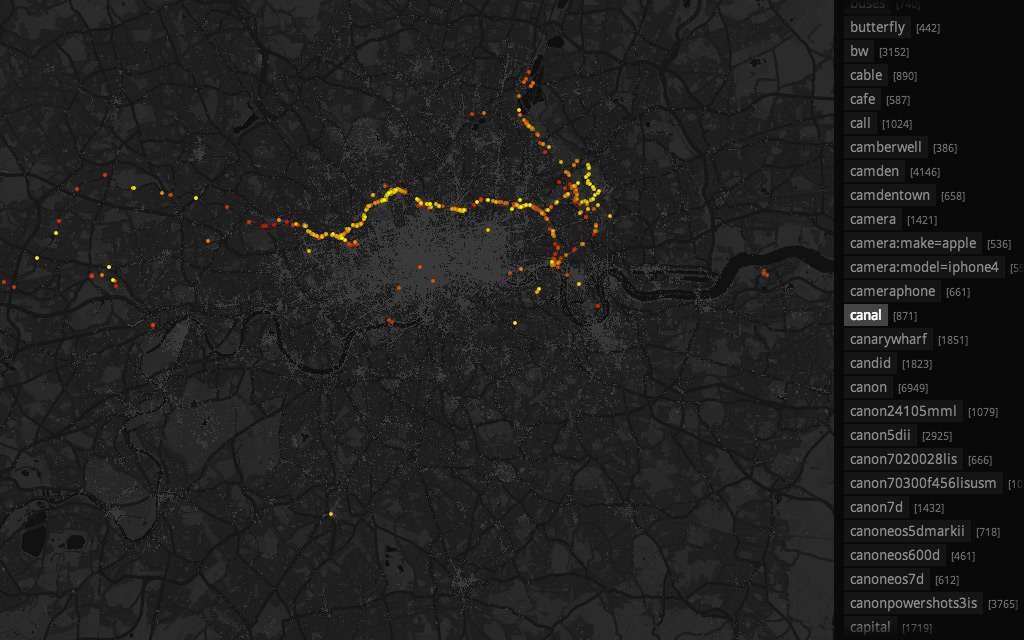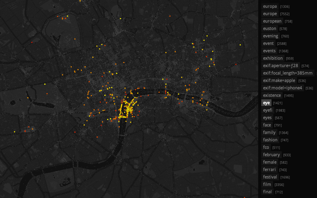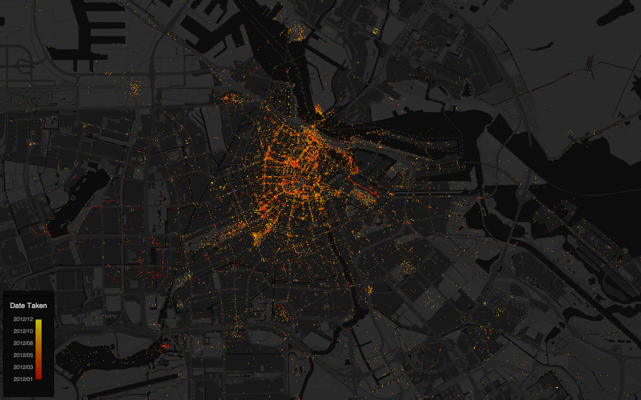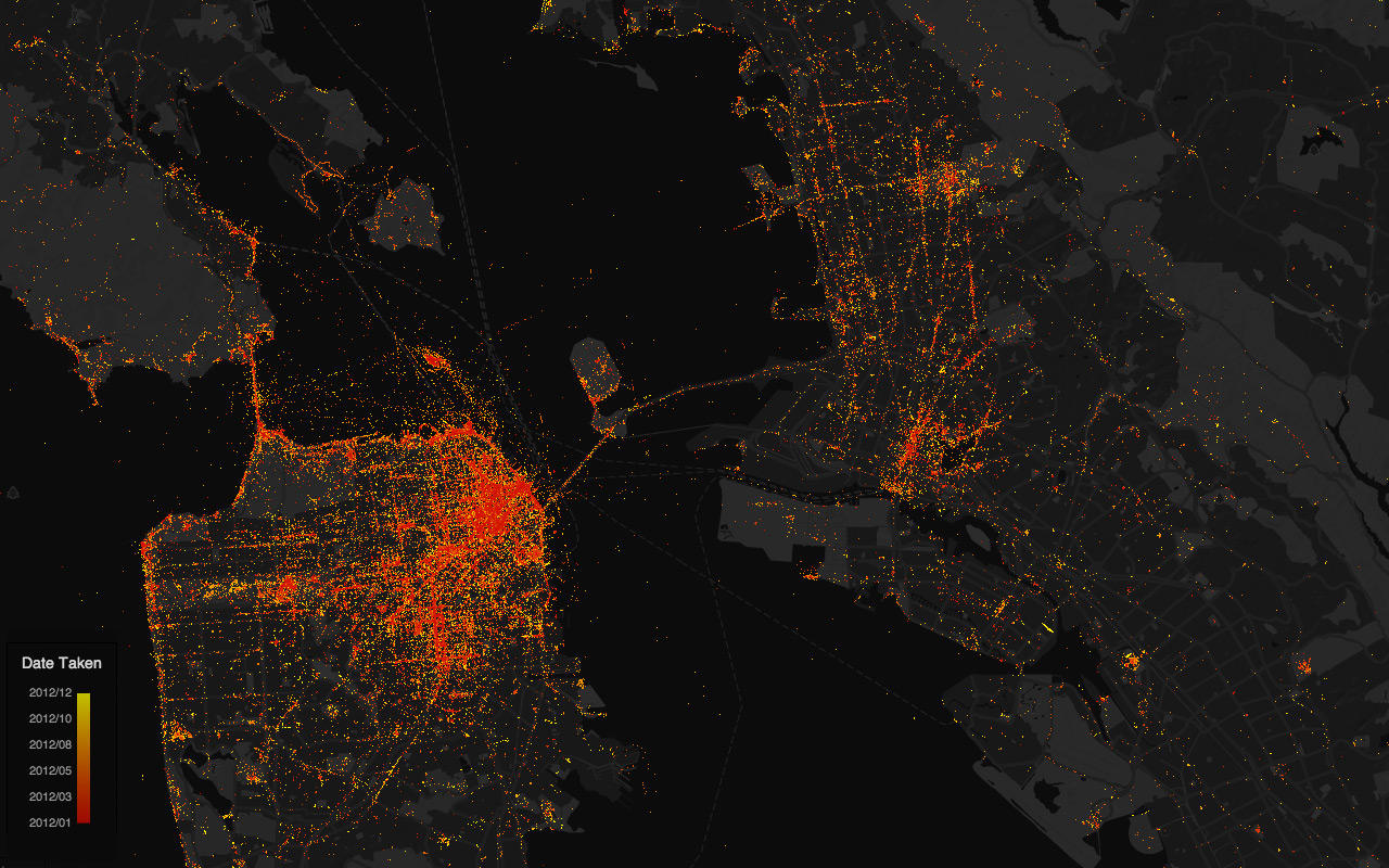 The Flickr API has been used to generate temporal city level maps. Like the archaeological record, these traces and mappings are never complete and always highly contingent: