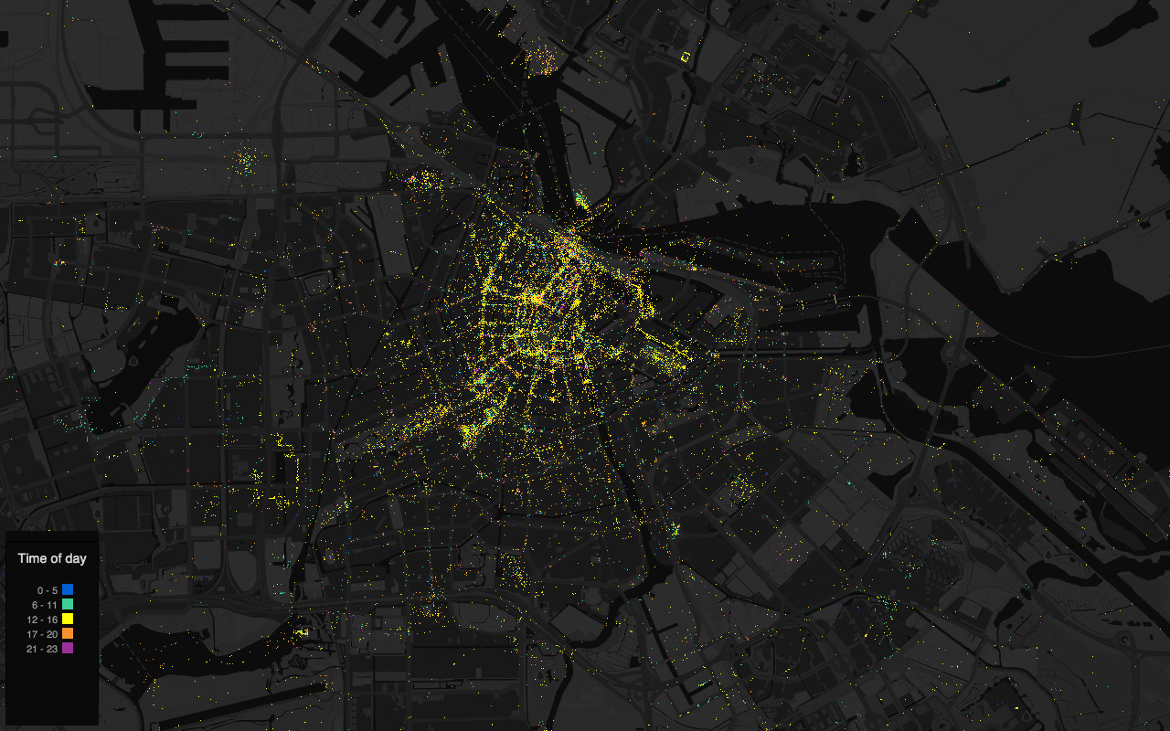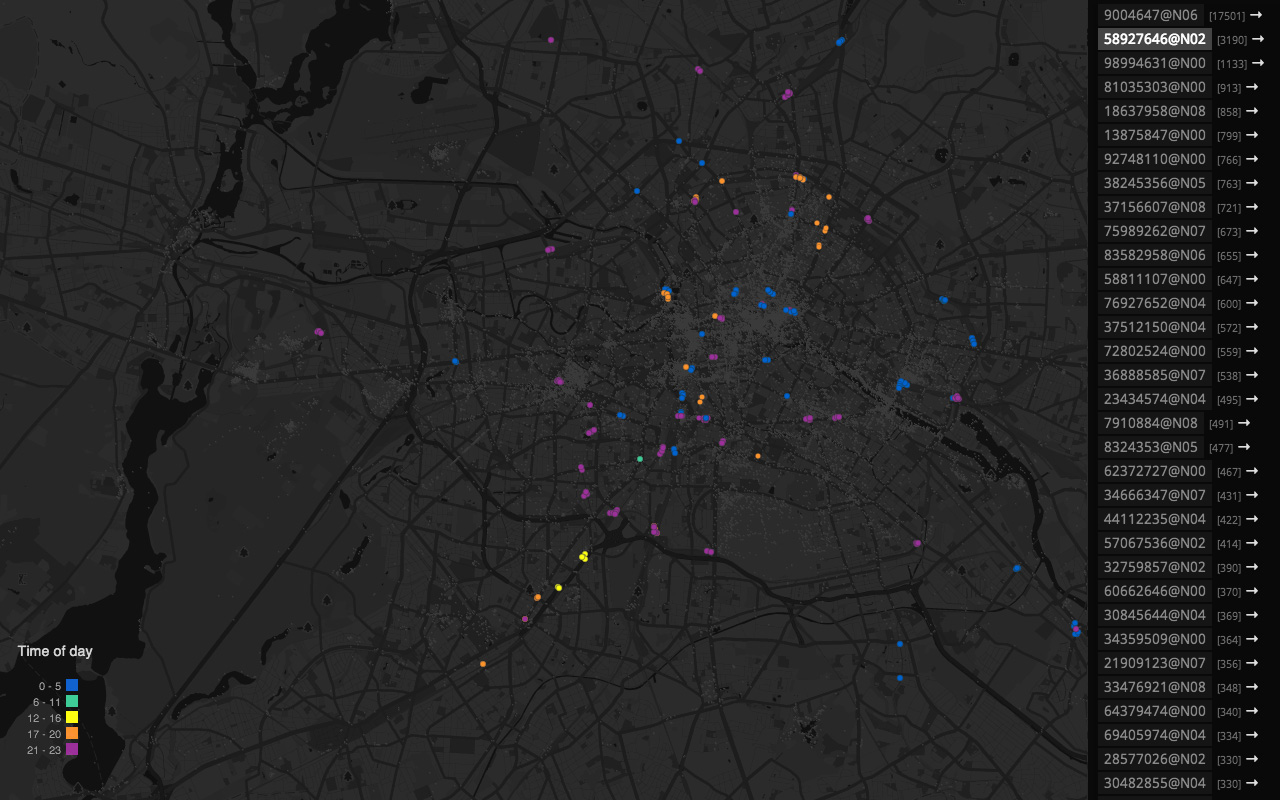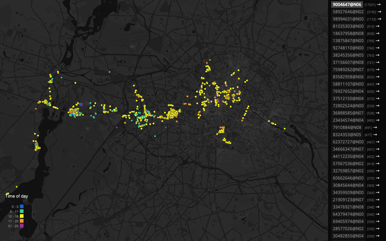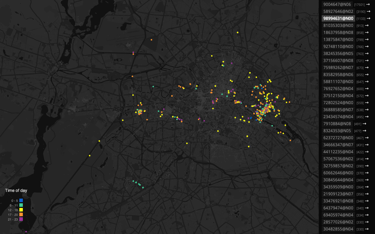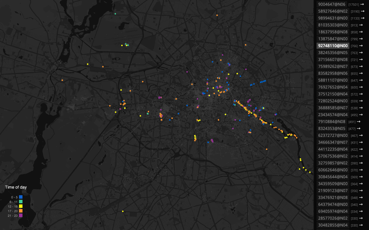 In a Flickr users version of the project, the top 1000 users by numbers of uploaded photos are displayed. This gives us a further way of viewing locations according to who has taken and uploaded a photo. The different spatial configurations of user photo locations very quickly highlight the different usage patterns of how individuals see and respond to the city. The selection of images below are from Berlin in 2012, the metric displayed is time of the day, which gives further insight into when users are active.